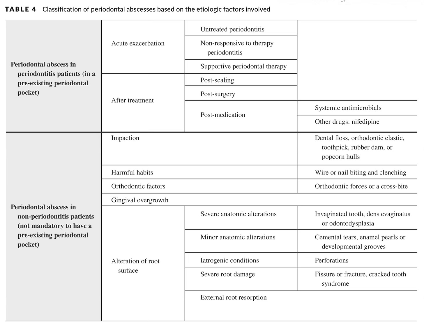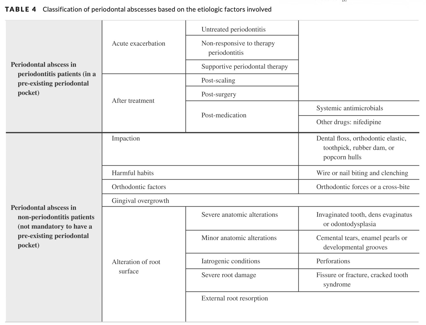 Aktuálny konsenzus je v tomto oveľa rozumnejší. Odporúča klasifikovať absces jednoducho podľa etiológie – či ide o absces u pacienta s parodontitídou, alebo bez parodontitídy. Jednoduchšie a hlavne klinicky použiteľné.