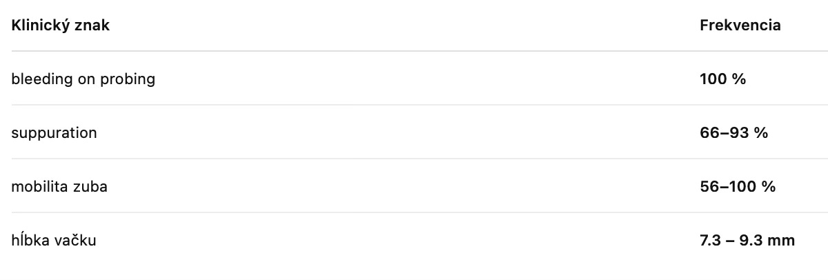 Klinicky by sme však parodontálny absces prehliadnuť nemali. Typicky vidíme ovoidný opuch gingivy najčastejšie pri laterálnej časti koreňa, hlboký parodontálny chobot, krvácanie pri sondáži a často aj supuráciu.