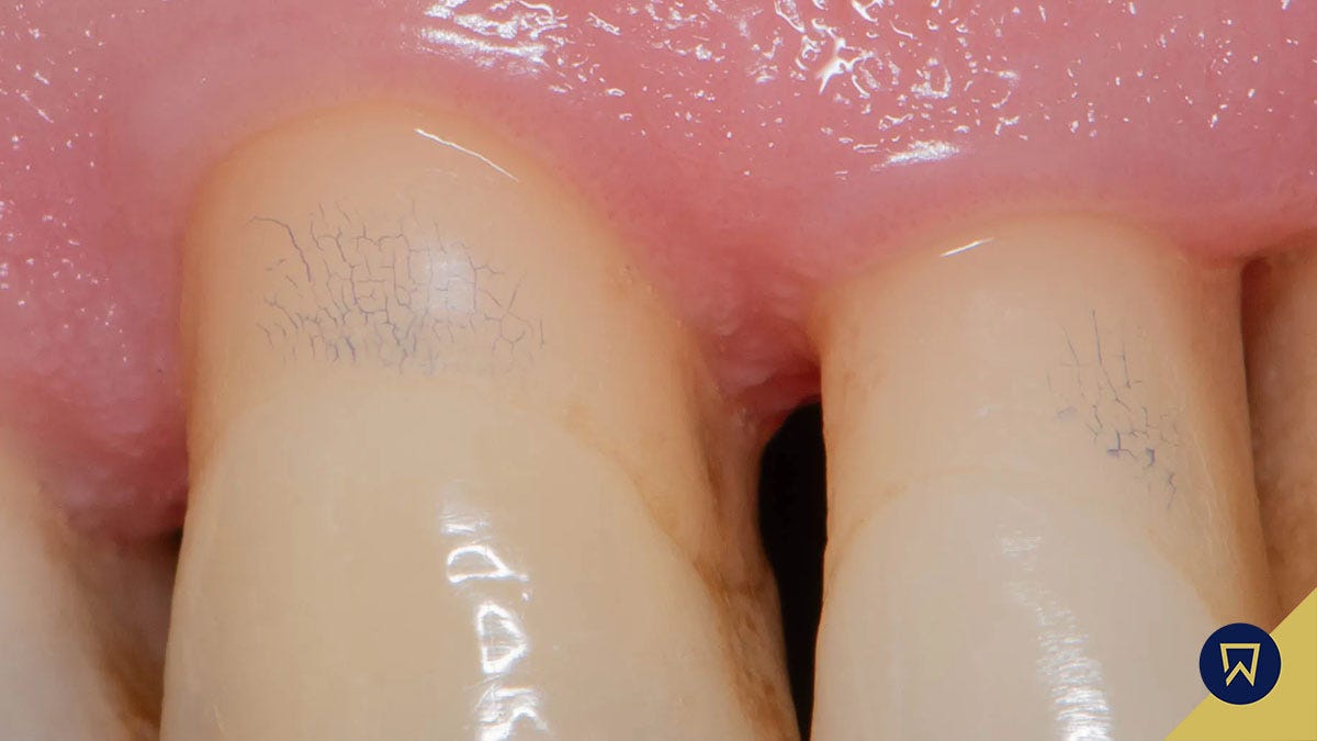 V mieste narušeného koreňového cementu sa detekčná tekutina vpila do povrchu a vytvorila „žilovú“ štruktúru, ktorú už nie je možné odstrániť. Krásne umelecké dielo 😄.